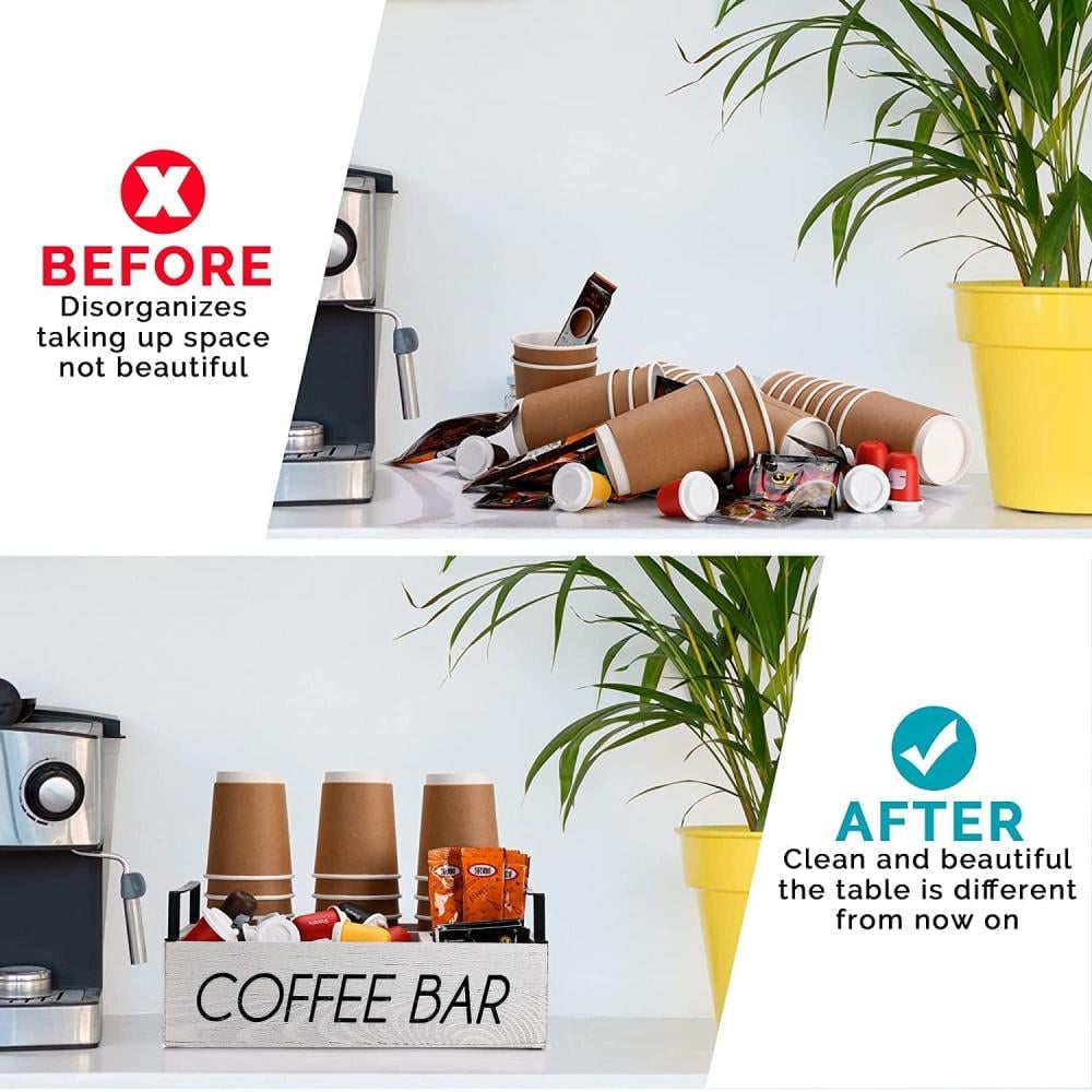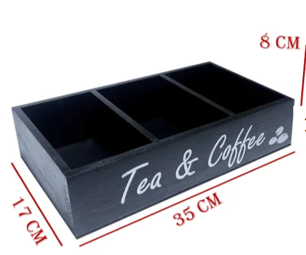 ✅ مصنوع من الخشب، ومقسم إلى ثلاث مساحات لتخزين الأكواب، السكر، أعواد التحريك، وأكياس القهوة والشاي.